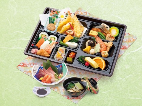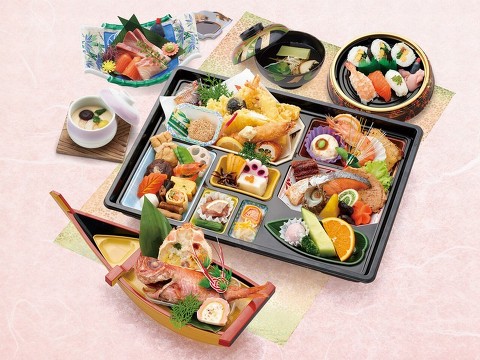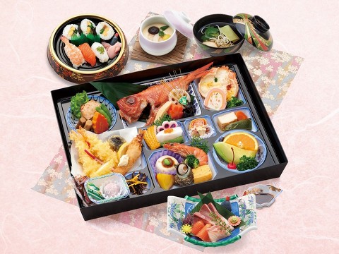 清流 本膳、刺身、寿司、刺身、吸い物、茶碗蒸のセット